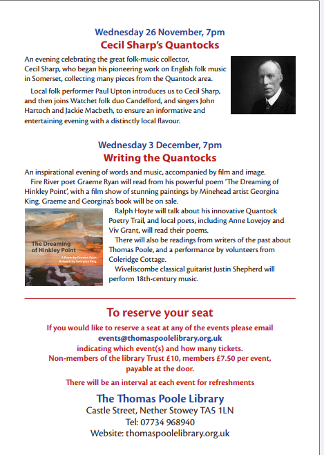 Tom Poole Library is hosting a series of autumn evening talks that delve into the rich visual art and literary culture of the Quantocks. Details and ticket prices are below.